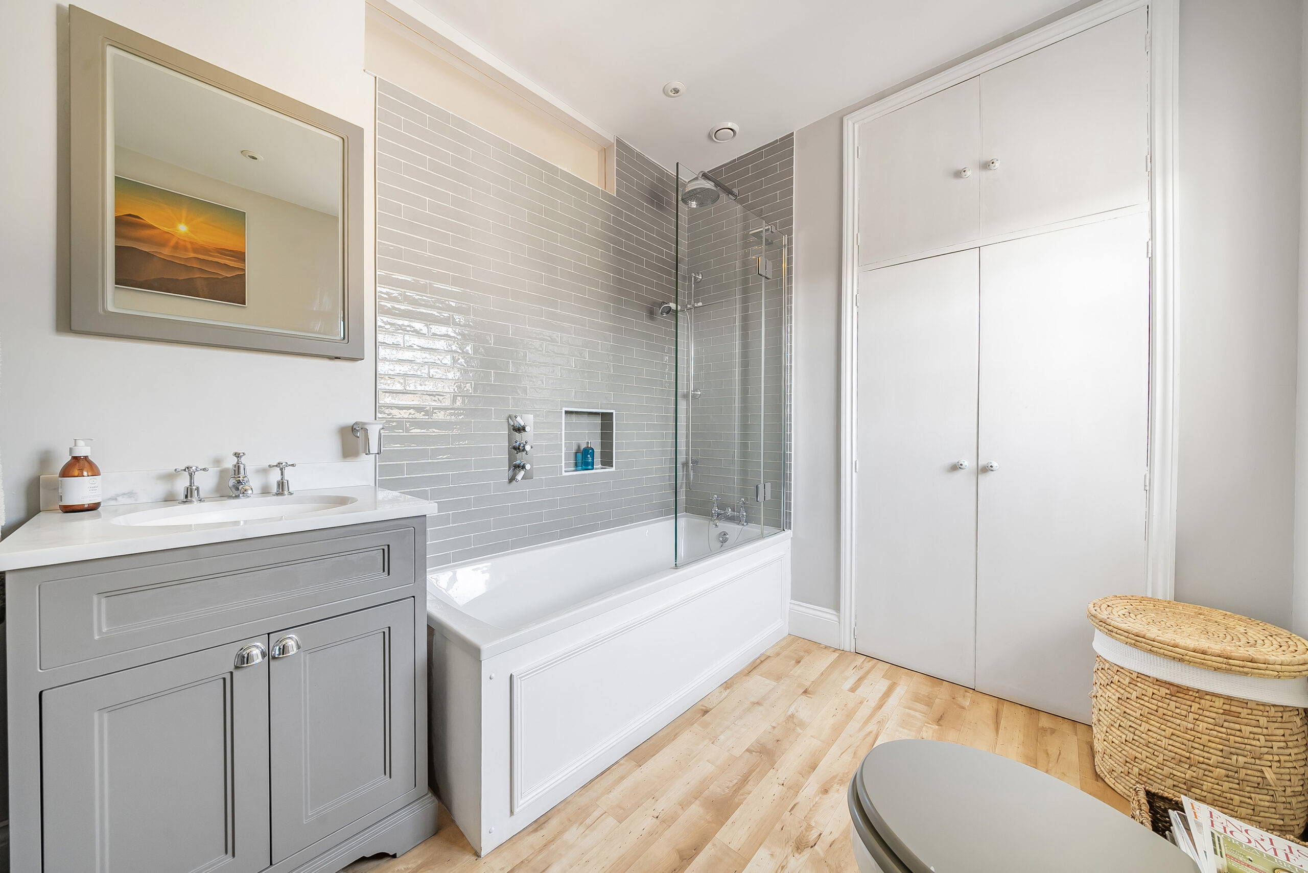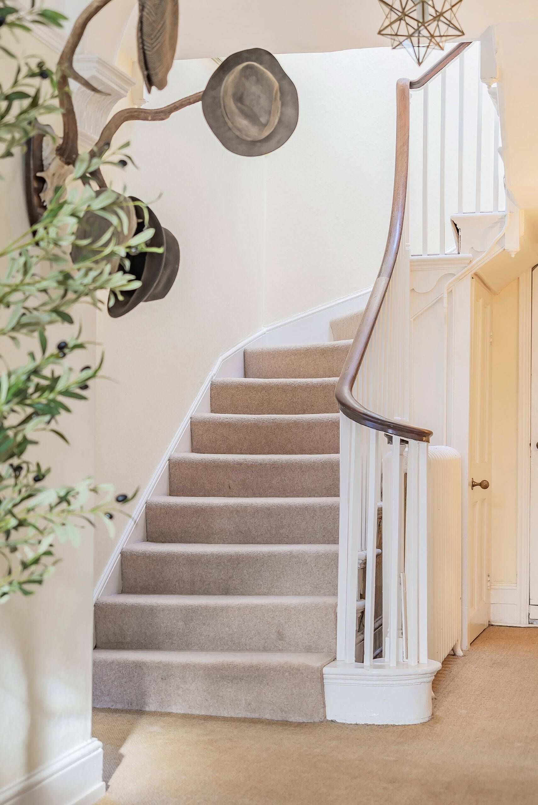 The kitchen is filled with natural light and is incredibly spacious, and really feels like it’s the focal point of family life, with a breakfast bar, dining table and space for further seating too. Off the kitchen is another reception room — perfect for a snug, playroom or office — and the vast utility room. Also from the kitchen is the second flight of stairs, leading up to bedroom two and the rest of the first floor. The downstairs WC sits under the graceful main staircase in the hallway.