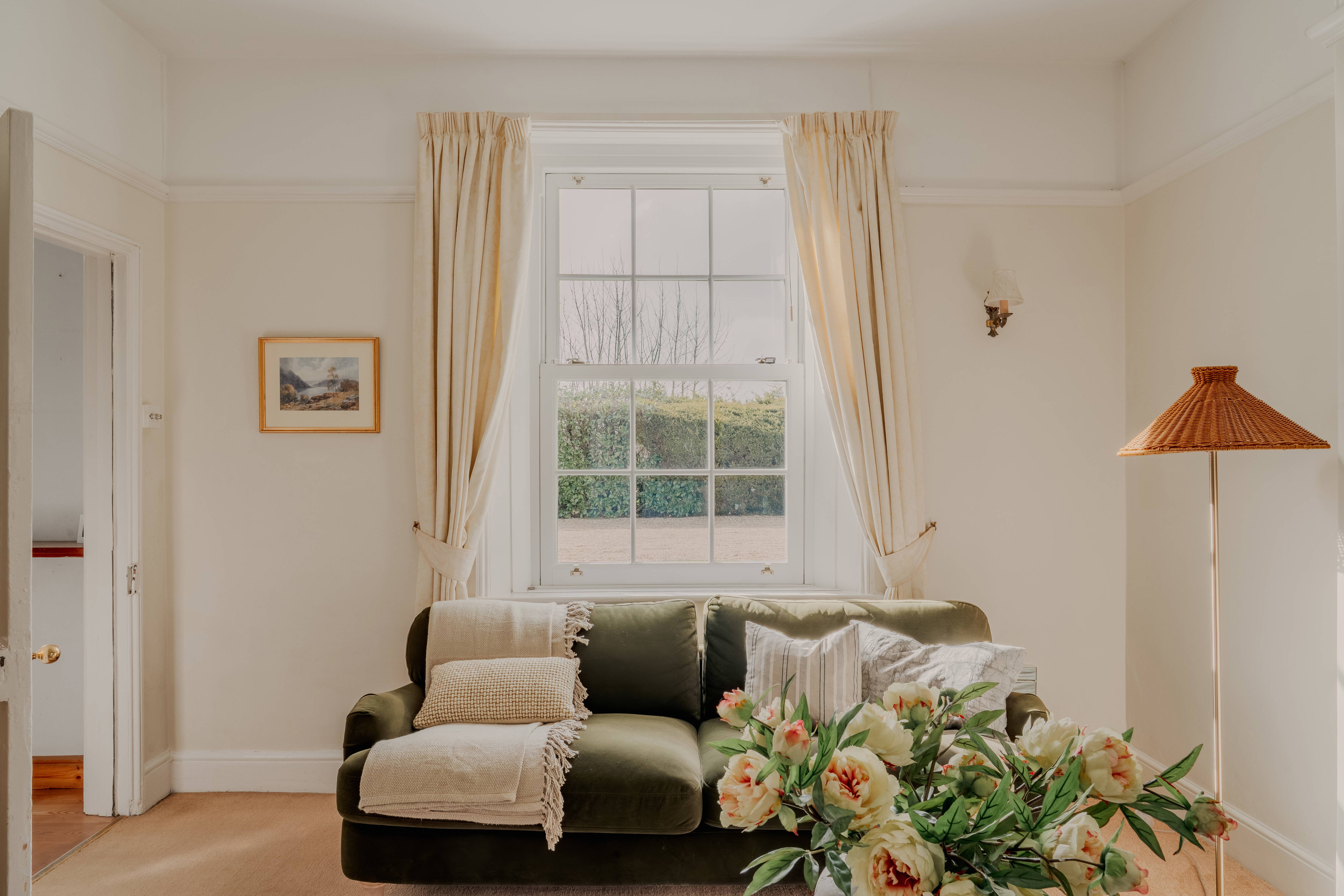Accessed down a sweeping driveway, through the idyllic mature gardens, the house is truly aesthetic with its central front door. Stepping into the hallway, the sitting room and dining room sit either side, providing comfortable reception spaces, each enhanced by the warmth and character of log burners, and both naturally lit with their south facing aspects. A conservatory extends from the sitting room, offering a superb vantage point to enjoy views over the gardens.