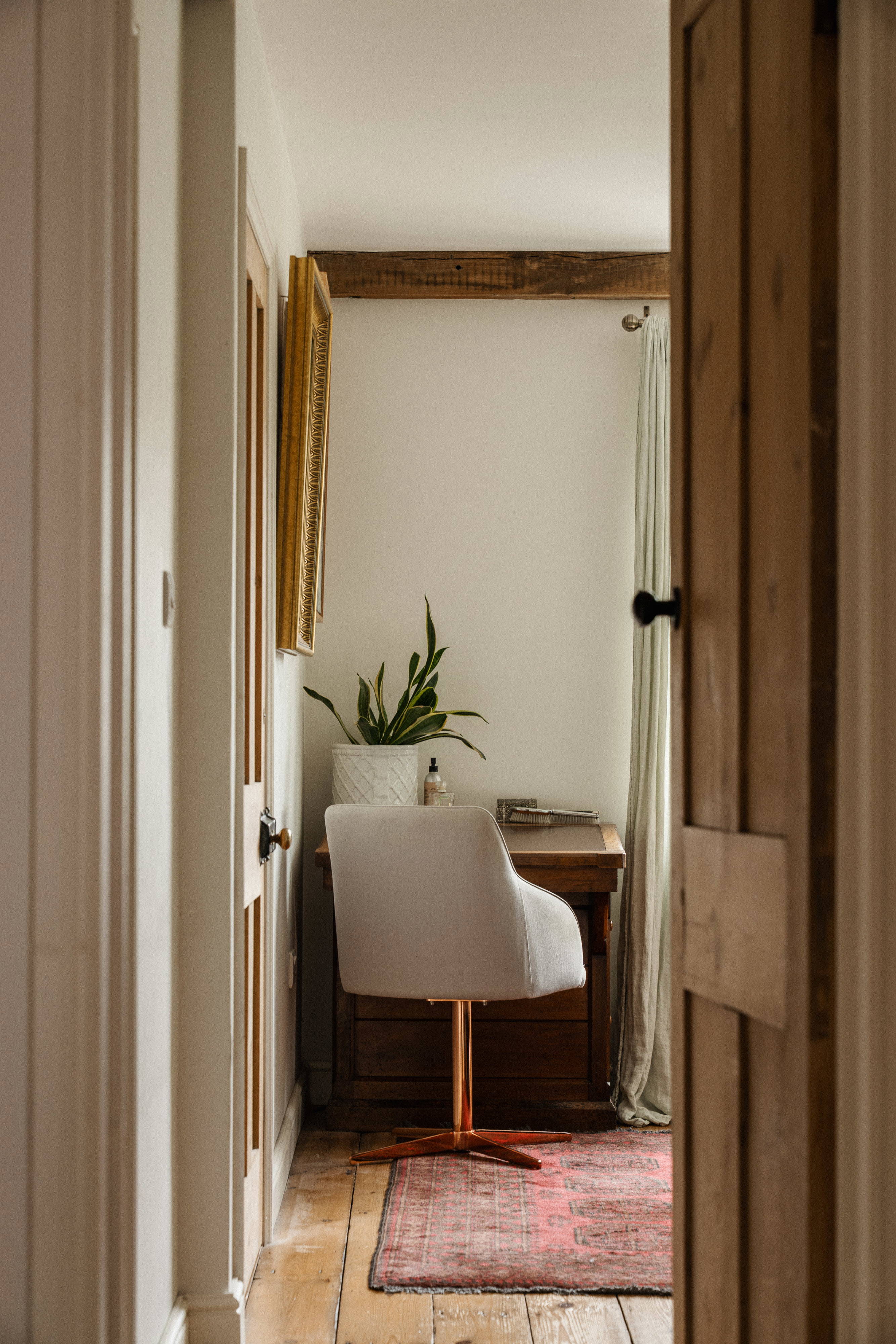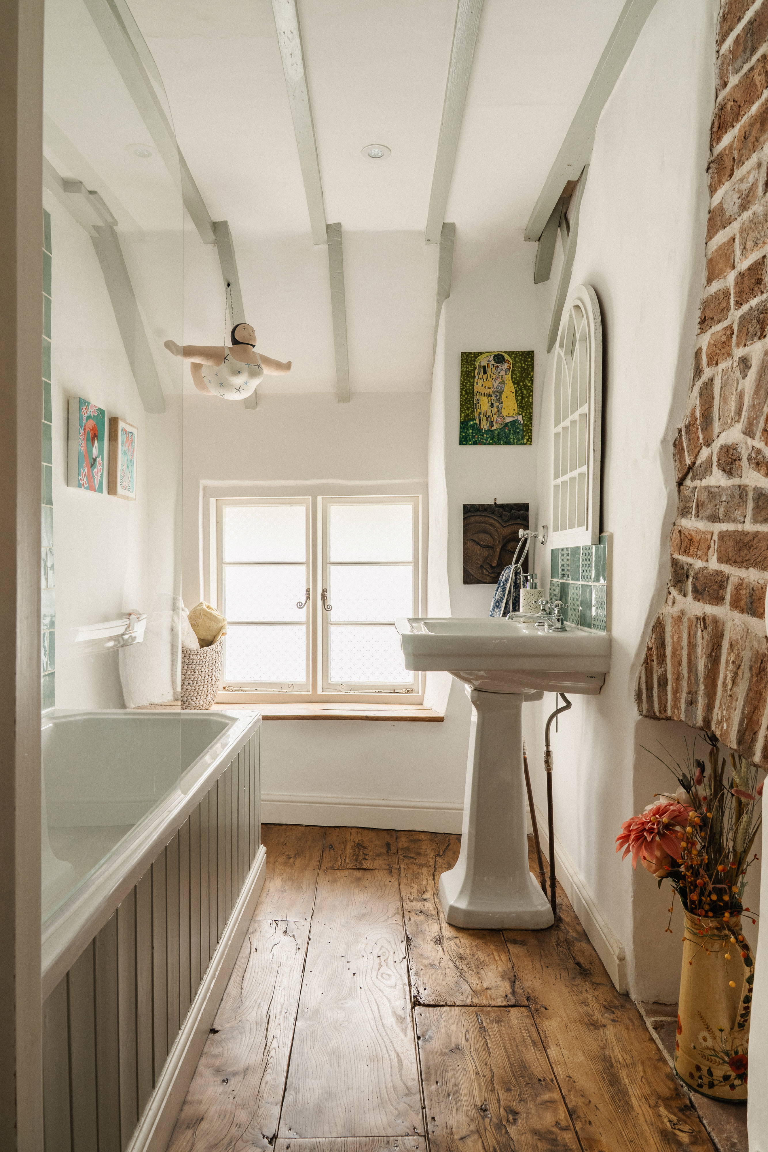 Stairs lead up from the kitchen, taking you to the three bedrooms. The main bedroom, created as part of the extension, overlooks the garden and benefits from a walk in wardrobe and shower en-suite. The family bathroom is spacious and boasts some of the most aesthetic details of the whole property, with beautiful wide floorboards and further brick detailing over an historic fireplace.