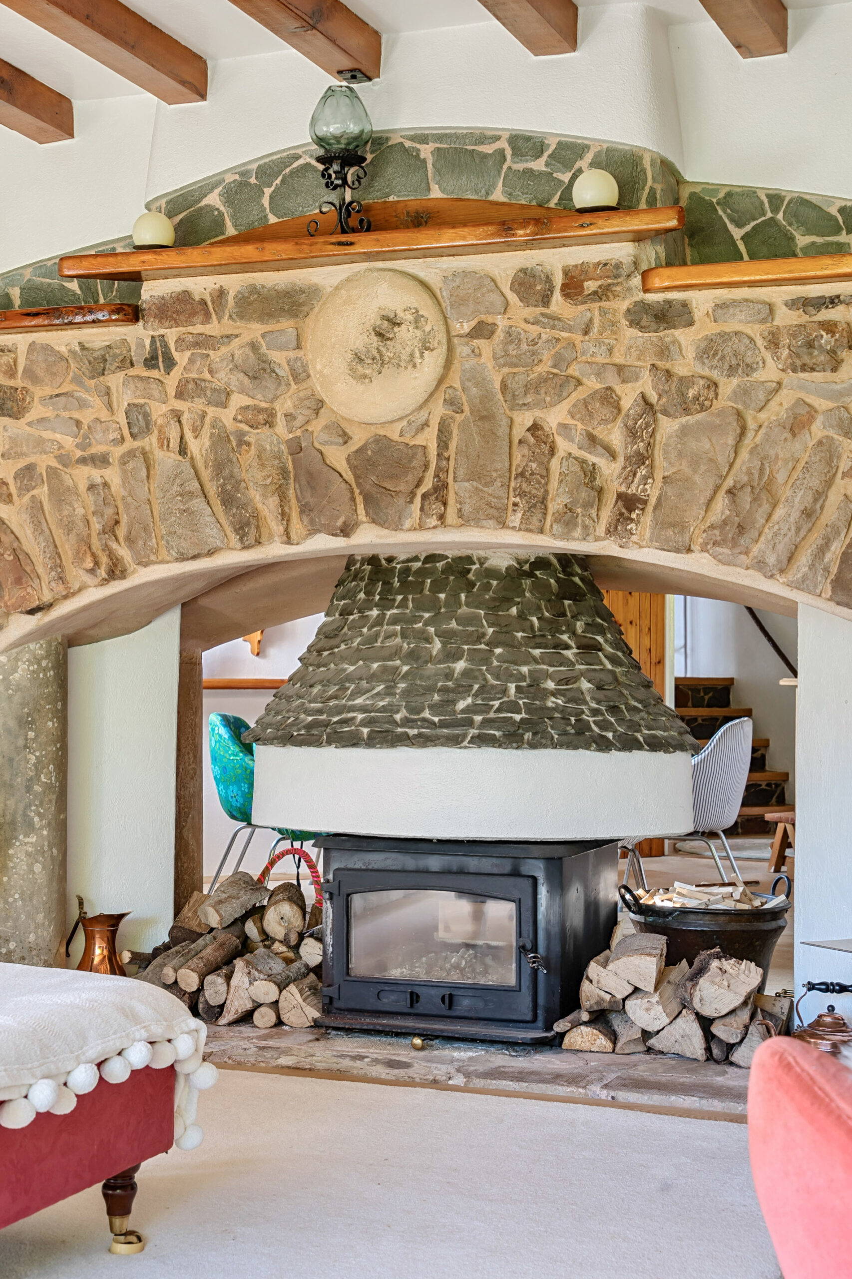 Dropping down from the country lane and along the driveway, you’re met by the colour and expanse of the garden that envelops the property, and immediately appreciate that you’re in an idyllic spot. A parking area for multiple vehicles lies in front of the large double garage and walking from here, passing through the sun soaked patio area, you come to the front door. Stepping inside into the central hallway, bedrooms two, three and four lie to the west side, along with the ground floor bathroom. Heading to the east end of the property from the hallway, steps drop you down to the lower ground floor and the kitchen. Beyond, a unique set up presents the dining room and sitting room either side of a fabulous wood burner. From the sitting room, the outlook to the garden is quite spectacular and doors allow access to the garden too. Upstairs is where the main bedroom lies, complete with a huge ensuite and further small kitchen space / laundry area.