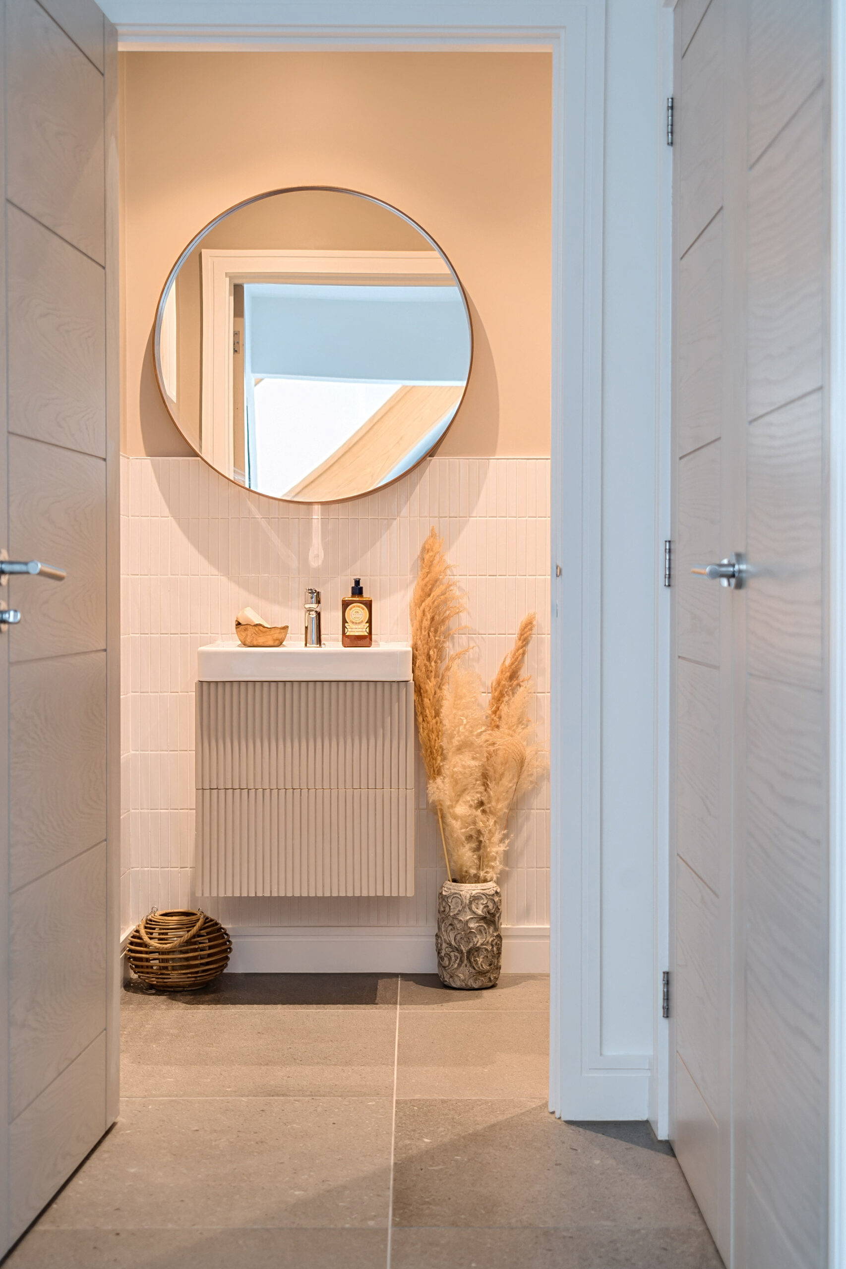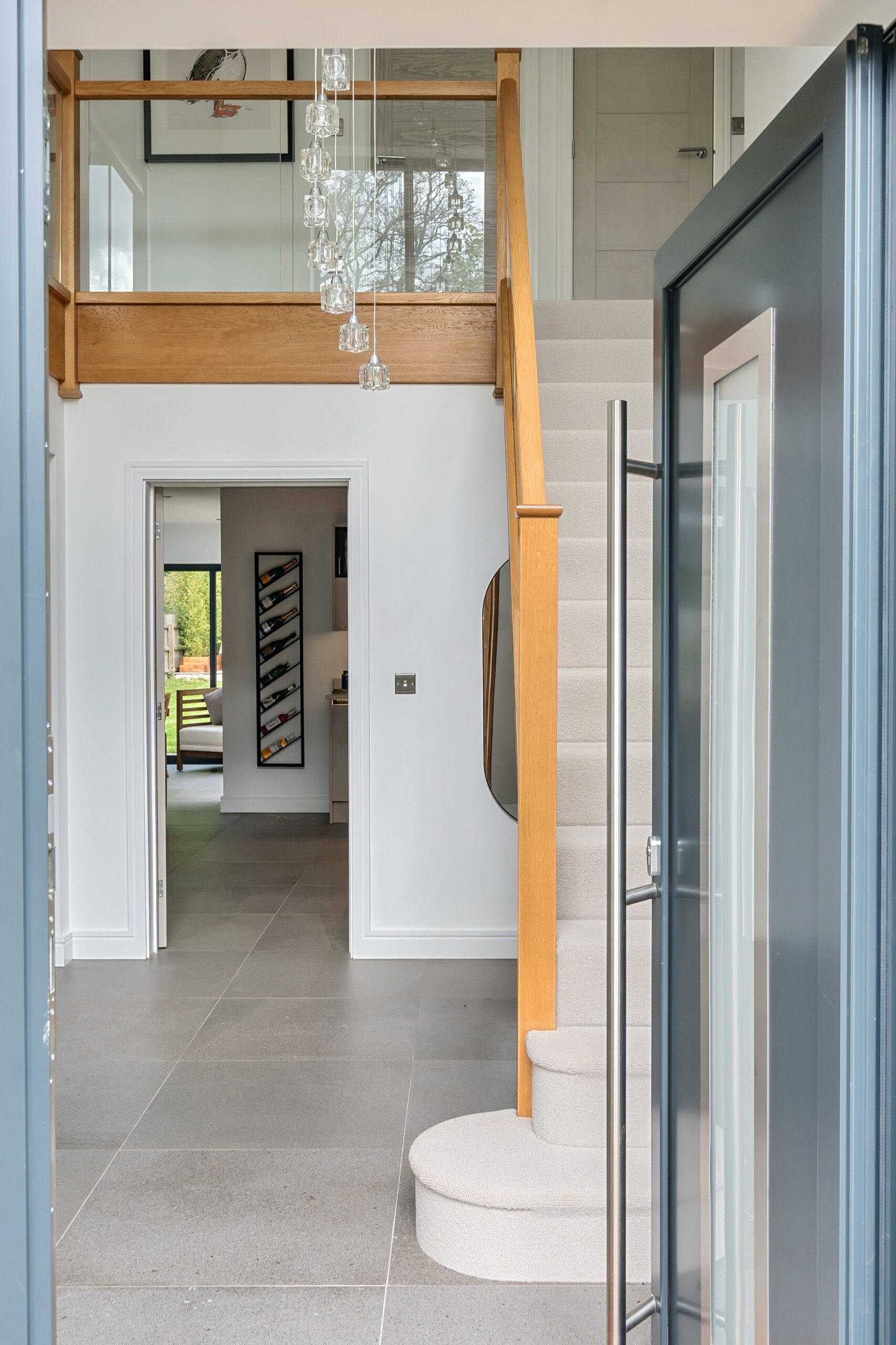 Entering the property, you step into the impressive atrium style hallway with its double storey glass frontage. Immediately, you appreciate the space and light. To the right, at the foot of the stairs is the study. This has recently been upgraded with porcelain tiles and striking LED lit panelled feature wall. This room also offers the flexibility for a downstairs fifth bedroom. Continuing through the hallway the sitting room is to the left, with floor to ceiling windows providing a lovely outlook over the front garden. Beyond the sitting room is a small corridor to the downstairs WC, which has also been recently retiled and decorated. Running along the corridor is the ‘utility cupboard’, where the controls are found for the underfloor heating, air source heat pump and solar panels.